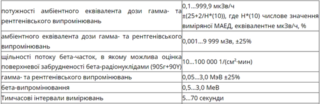| Діапазон енергетичного реєстрованого фотоного іонізувального випромінювання | 0.05...3 МВ |
